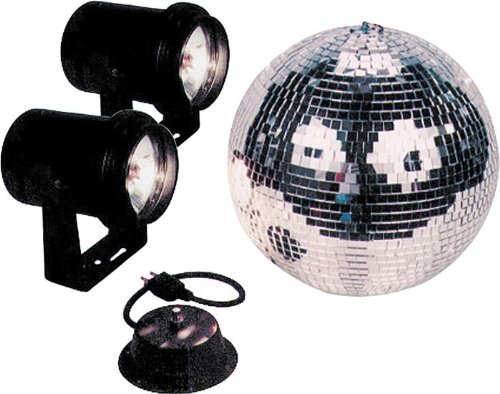 12 inch mirror ball system that includes 2x pinspot 1x mirror ball motor and 1x 12 inch mirrored ball The mirror ball is made of a composit material with the mounting clip that runs from the top to bottom to securely mount the ball to the motor. System also includes 4 color gels for the pinspots if the user desires to color the beams of light.