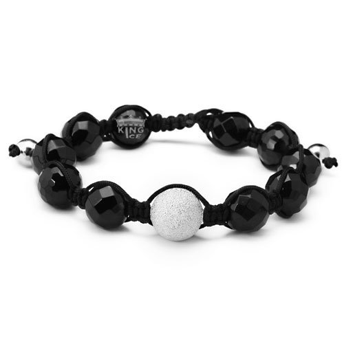12mm diamond cut round black agate beads surround a 14mm center silver plated sand blasted bead to create a unique Buddhist inspired hip hop style Jabari disco ball bracelet. 7"-9" adjustable length. Quality made with adjustable nylon string. NOTE! King Ice logo on the jewelry is just a watermark..../ Diamond Cut Black Agate and Silver Plated Sandblasted Buddhist Jabari Disco Ball Bracelet / disco ball